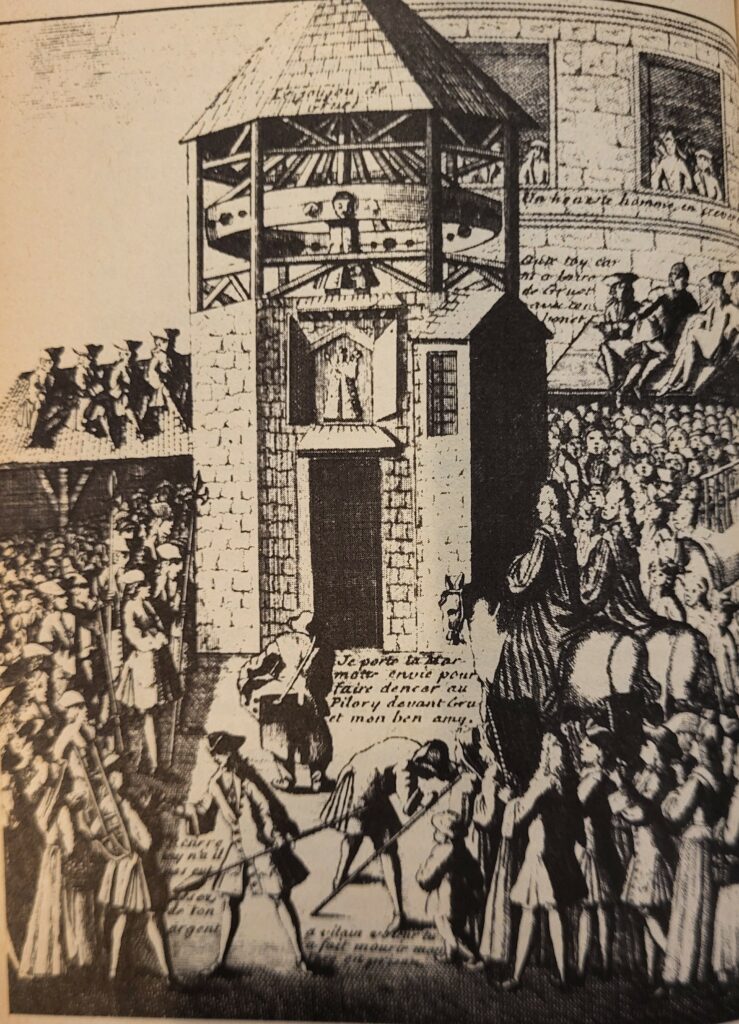 Dans l’ordre des peines criminelles du Moyen-Age, les piloris avaient pour ainsi dire une place de choix auprès du public parisien amenant le roi Philippe VI, en 1347, a en organisé l’usage . Ainsi, il légiféra que « l’exposition durera de prime à l’heure des nones, et lui pourra-t-on jeter aux yeux boues ou autres ordures sans pierres ni autre chose qui blessent et, après ce, demeurera au pain et à l’eau. »
