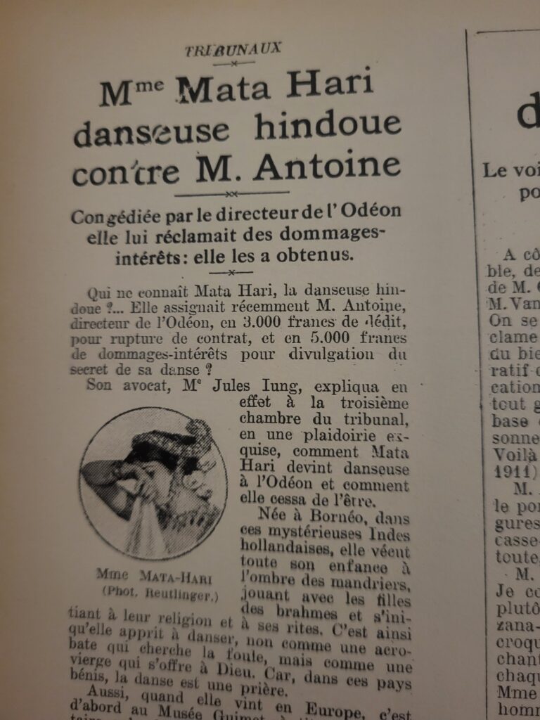 Le 24 décembre 1911 donc, l’Excelsior relate dans ses colonnes la victoire judiciaire de Mata-Hari contre le théâtre de l’Odéon dans lequel elle officiait en tant que danseuse. C’est pour avoir « oublier » de verser ses émoluments que le théâtre de l’Odéon, par son directeur M. Antoine fut condamné à lui verser la somme de 3000 francs au titre de dédit.