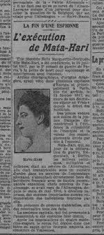 Cet article sorti la veille de Noël 1911 aurait pu signifier la fin de cette notoriété et la plonger dans un quelconque anonymat. L’Histoire lui réservera pourtant un tout autre destin, tragique celui-là puisque en pleine première guerre mondiale, convaincue d’intelligence avec l’ennemi, elle sera, au terme d’un procès bâclé, condamnée à la peine de mort et fusillée au polygone de tir de Vincennes le 15 octobre 1917 : « Tandis qu’un officier donne lecture du jugement, la danseuse, qui a refusé de se laisser bander les yeux, très crâne, se place d’elle-même contre le poteau, une corde, qui n’est même pas nouée, passée autour de la ceinture… Le peloton d’exécution, composé de douze chasseurs à pied, quatre soldats, quatre caporaux, quatre sous-officiers, est à dix mètres d’elle… Mata Hari sourit encore à sœur Léonide agenouillée et fait un geste d’adieu. L’officier commandant lève son sabre : un bruit sec, suivi du coup de grâce moins éclatant et la Danseuse rouge s’écroule tête en avant, masse inerte qui dégoutte de sang… » (Léon Clément Bizard).